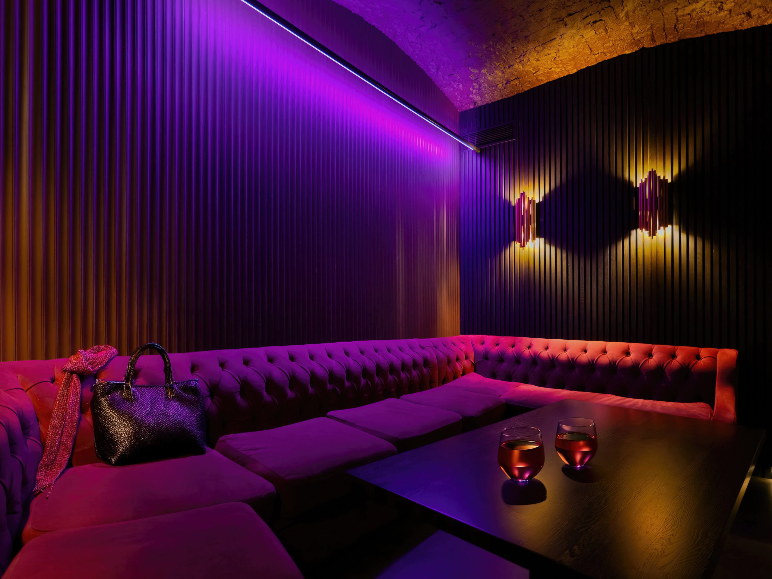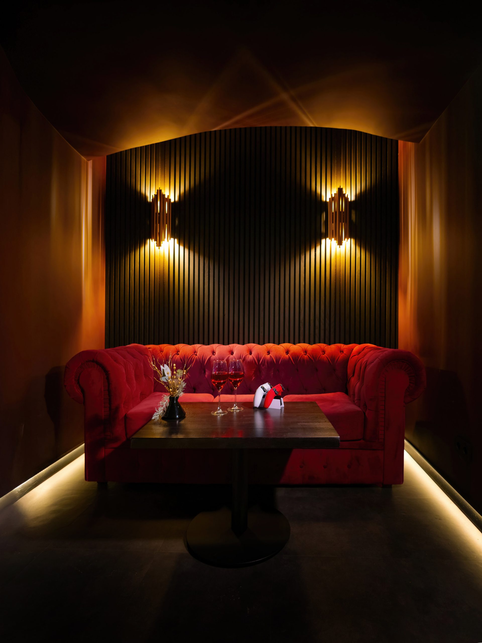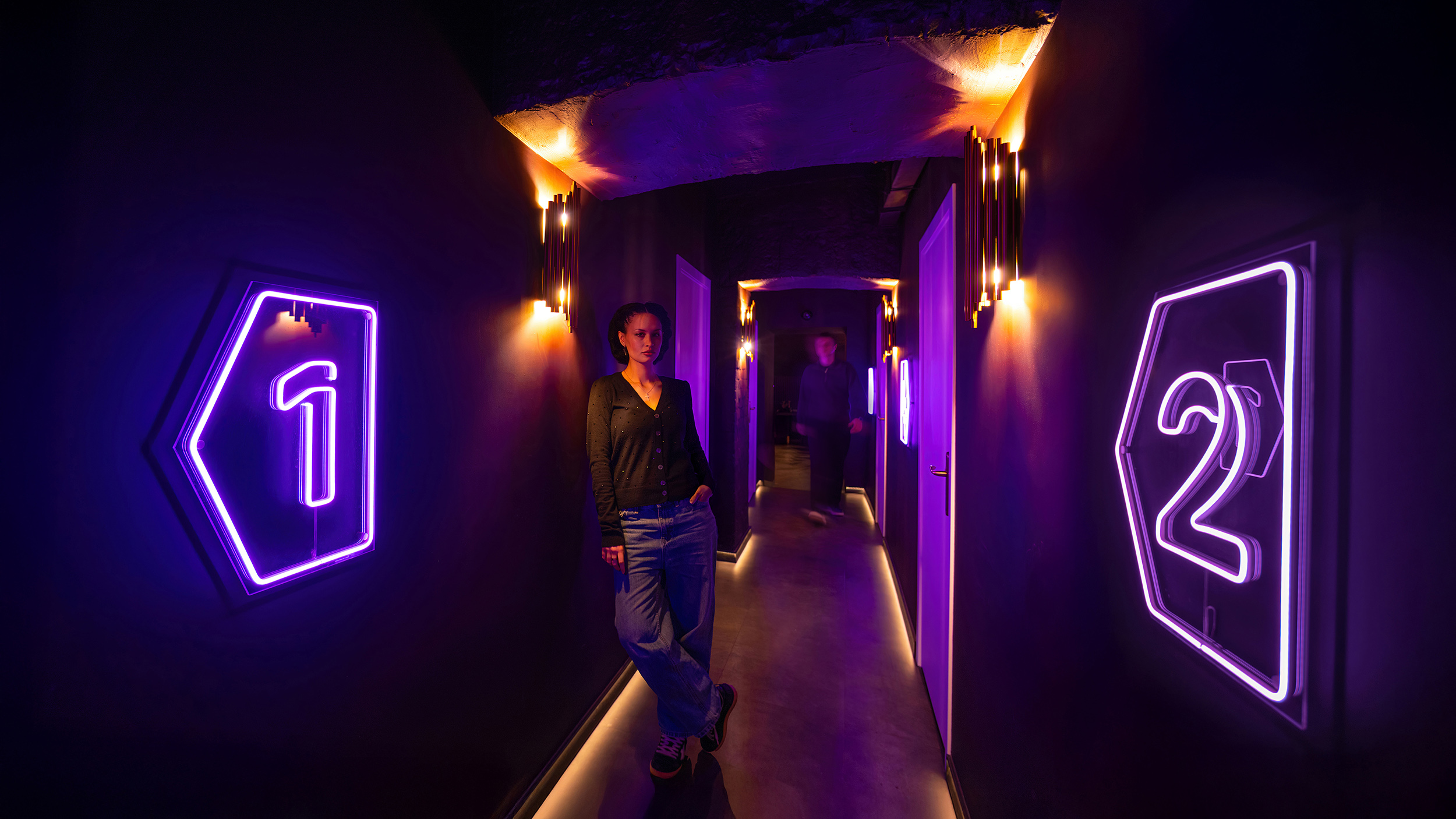 Третий мир: тесные каморки. Три на два метра. Вряд ли тут жили. Окон нет. Тут были либо кладовые, либо камеры. Теперь — диван, столик, телевизор. Два света: приглушённый — для настроения, и практичный — чтобы упавший пульт искать. Я использовал источник с узким тубусом. Создавал акцент. Точечно.