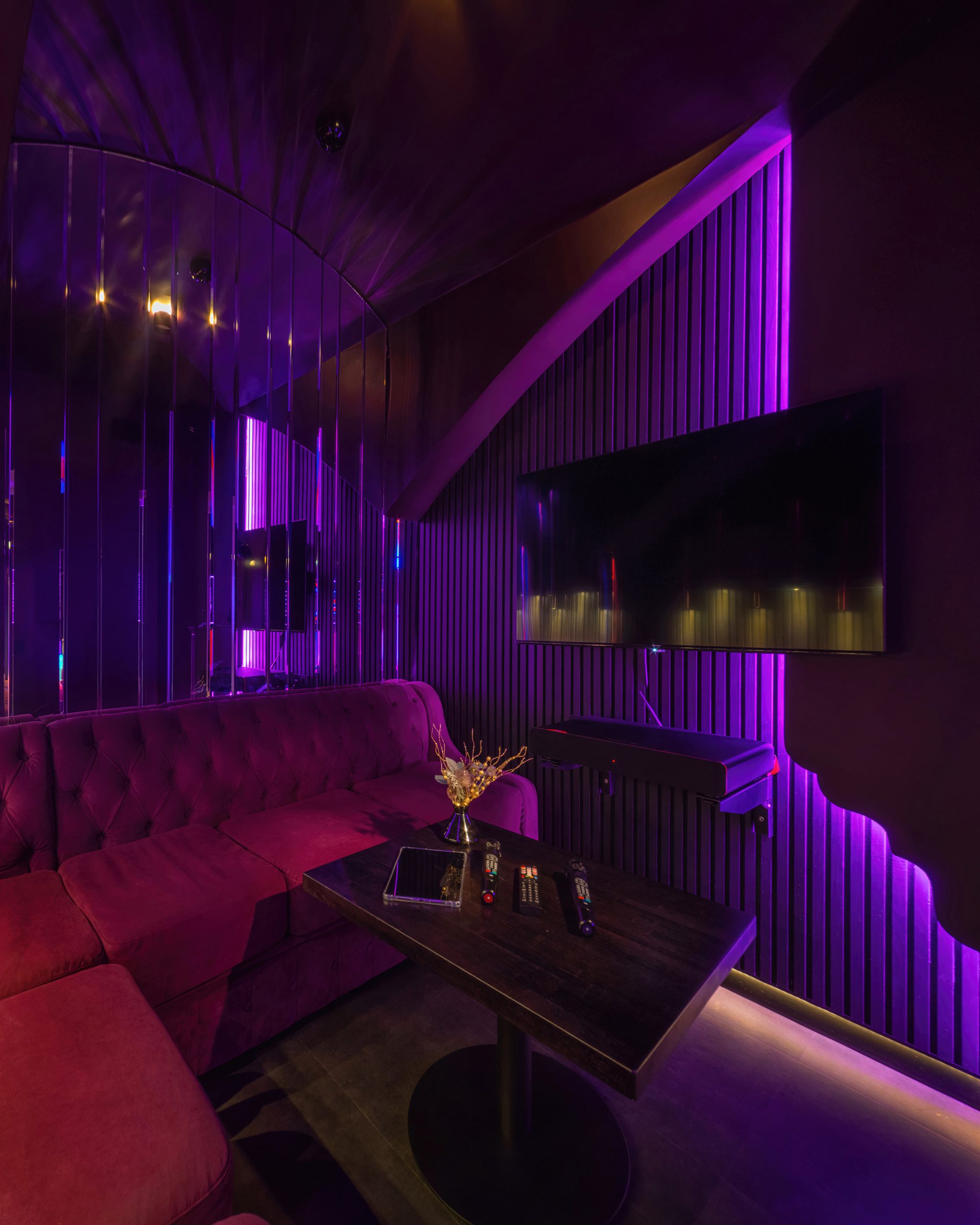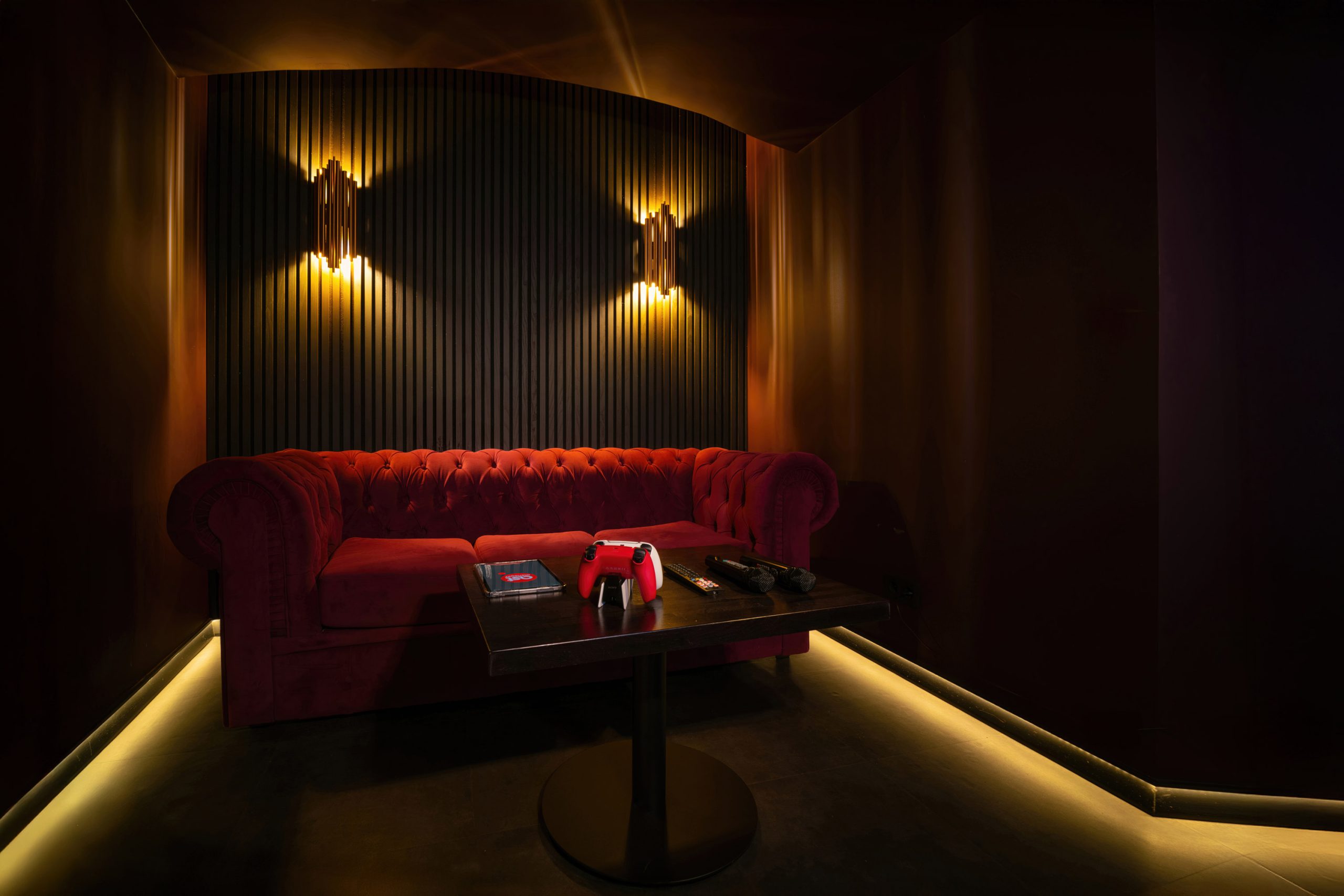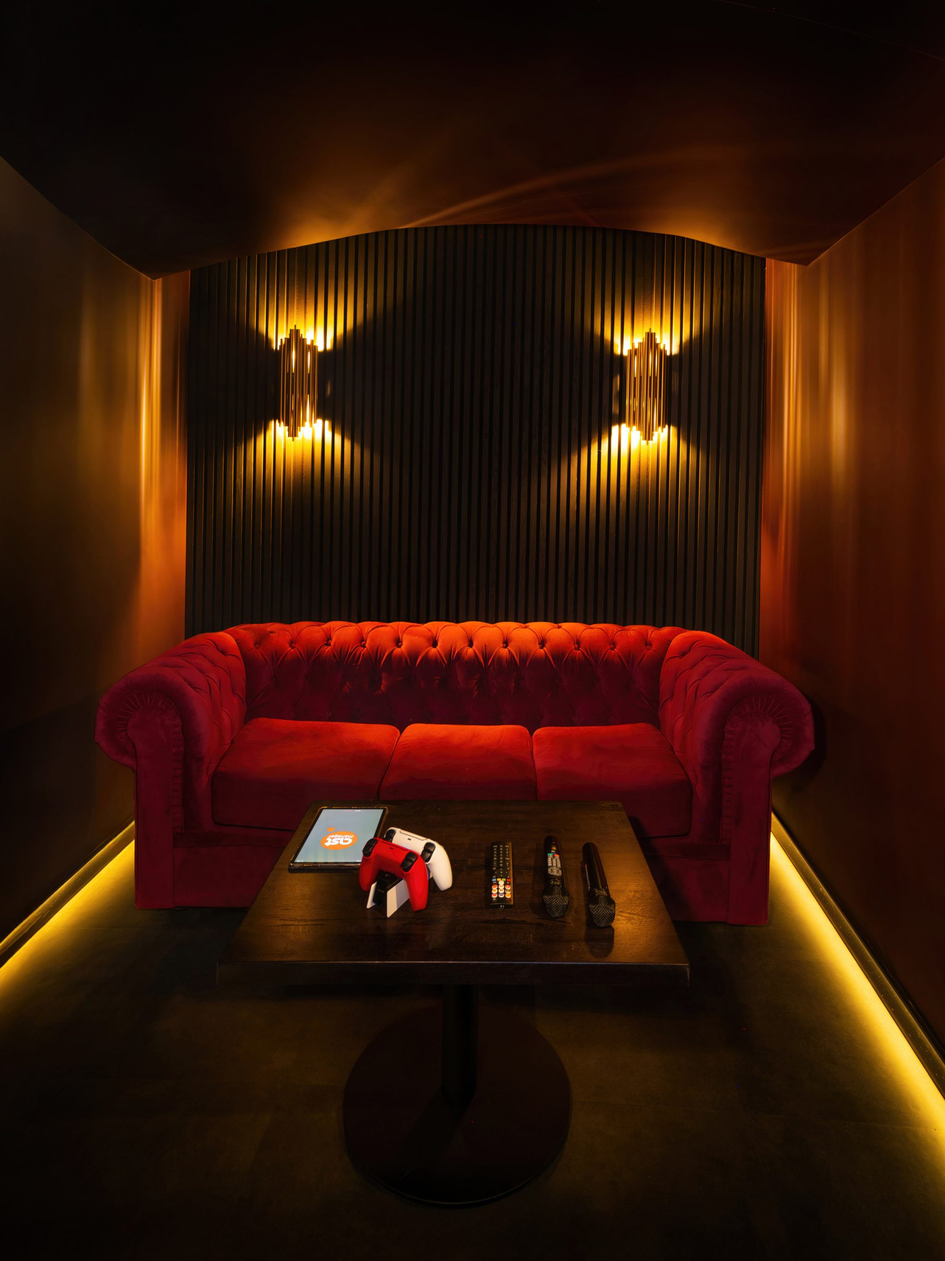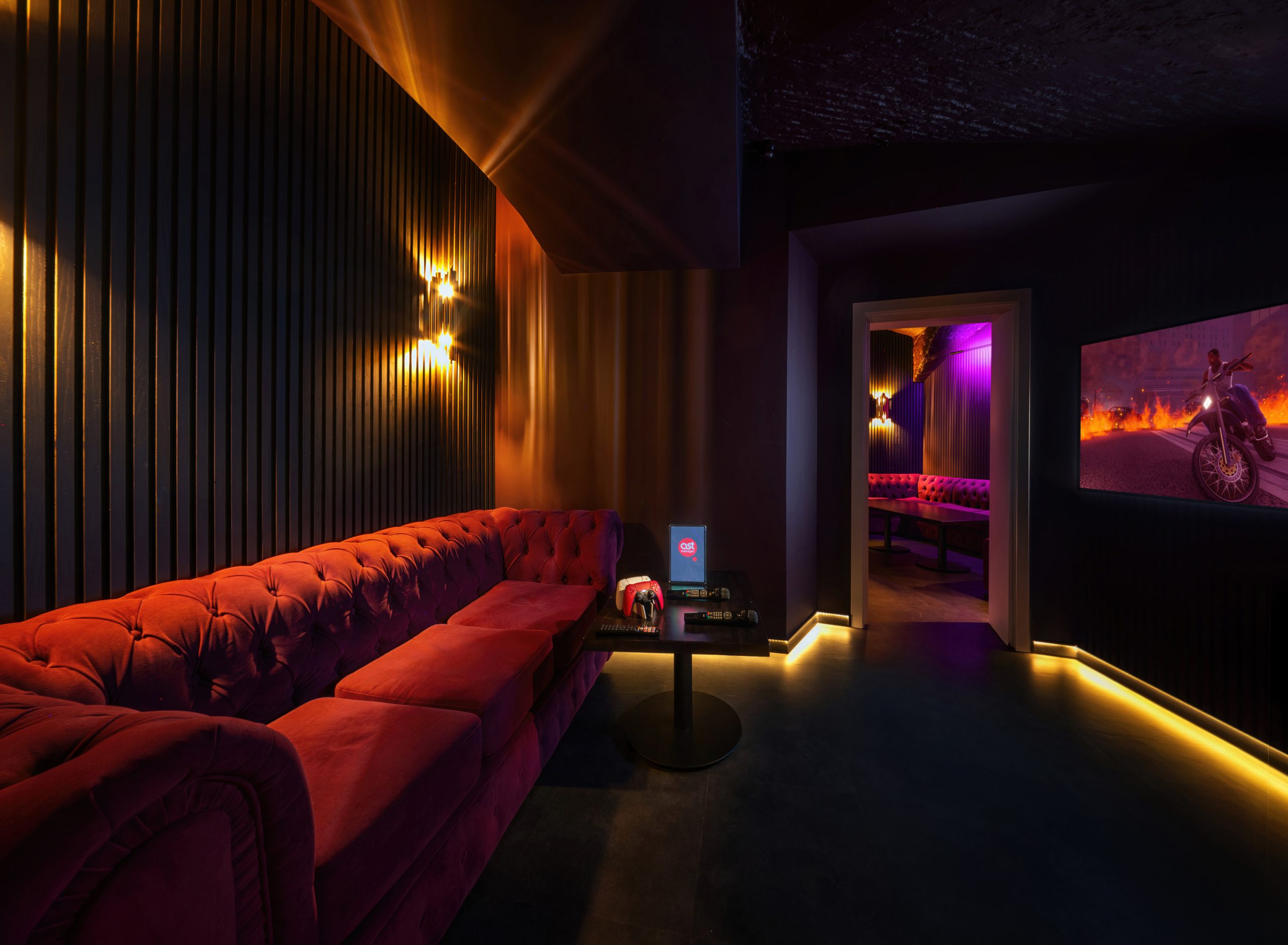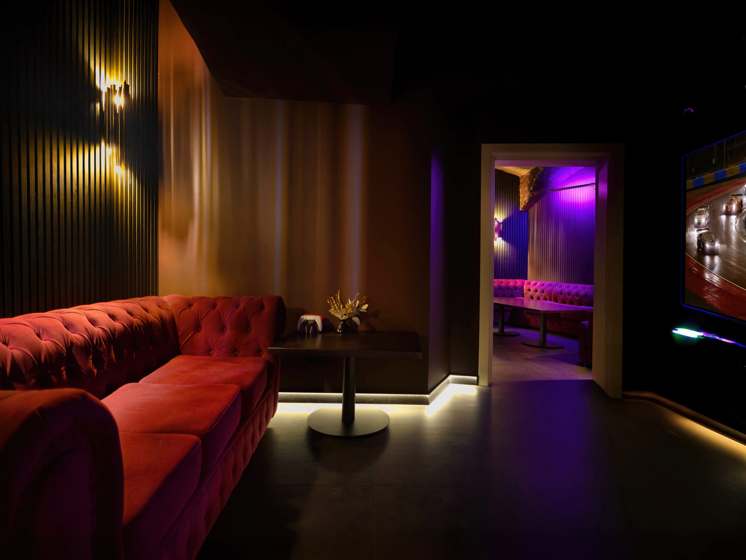 Второй мир: две комнаты и лишняя дверь. Для игр и для караоке. Проблема одна — белая дверь между ними. На фото она кричала. Я спросил: «Уберём?». Ответ обрадовал: «Фотографии должны атмосферу передавать, а не чертёж». В обработке стер дверь, но белый проем оставил.