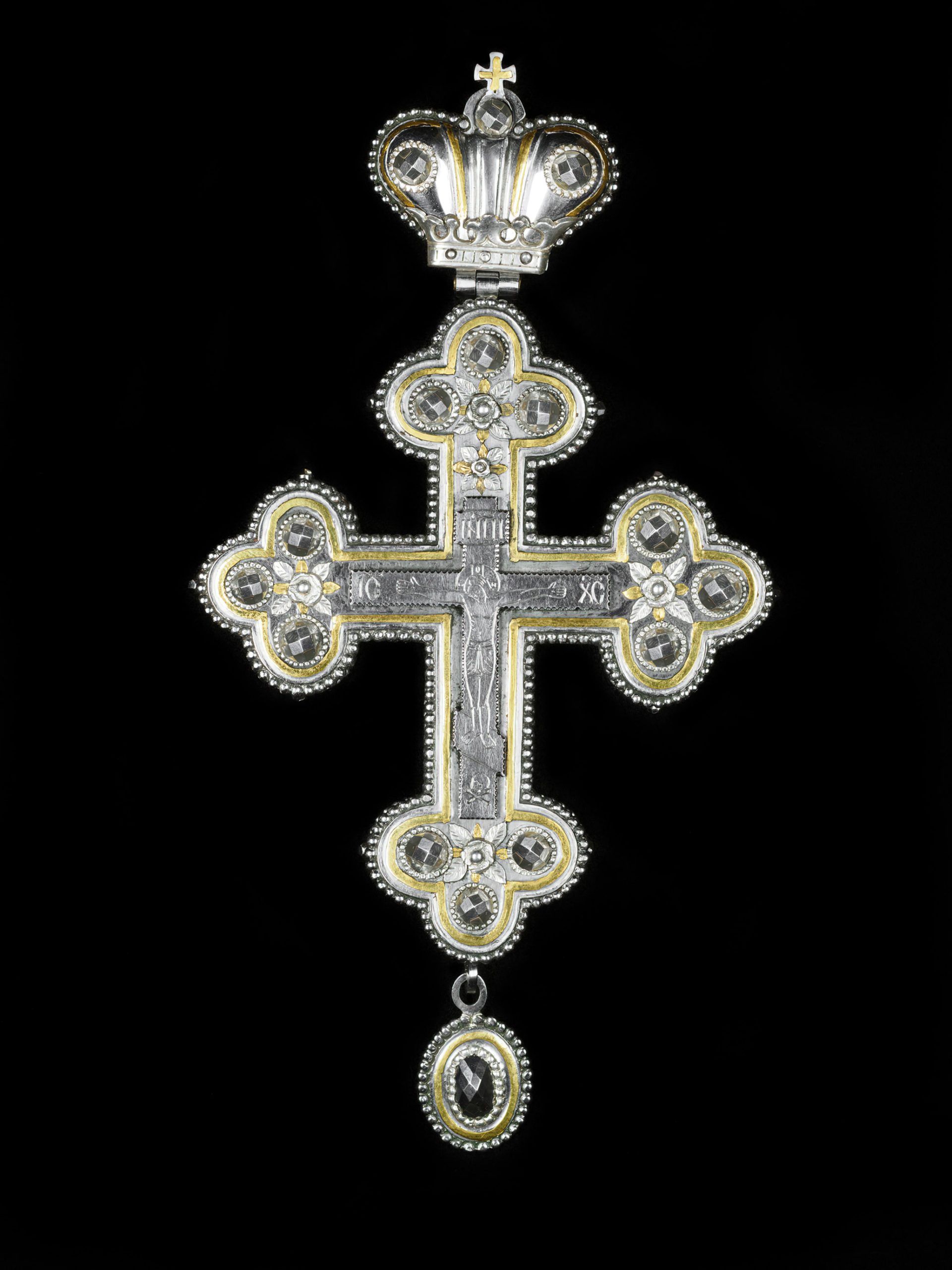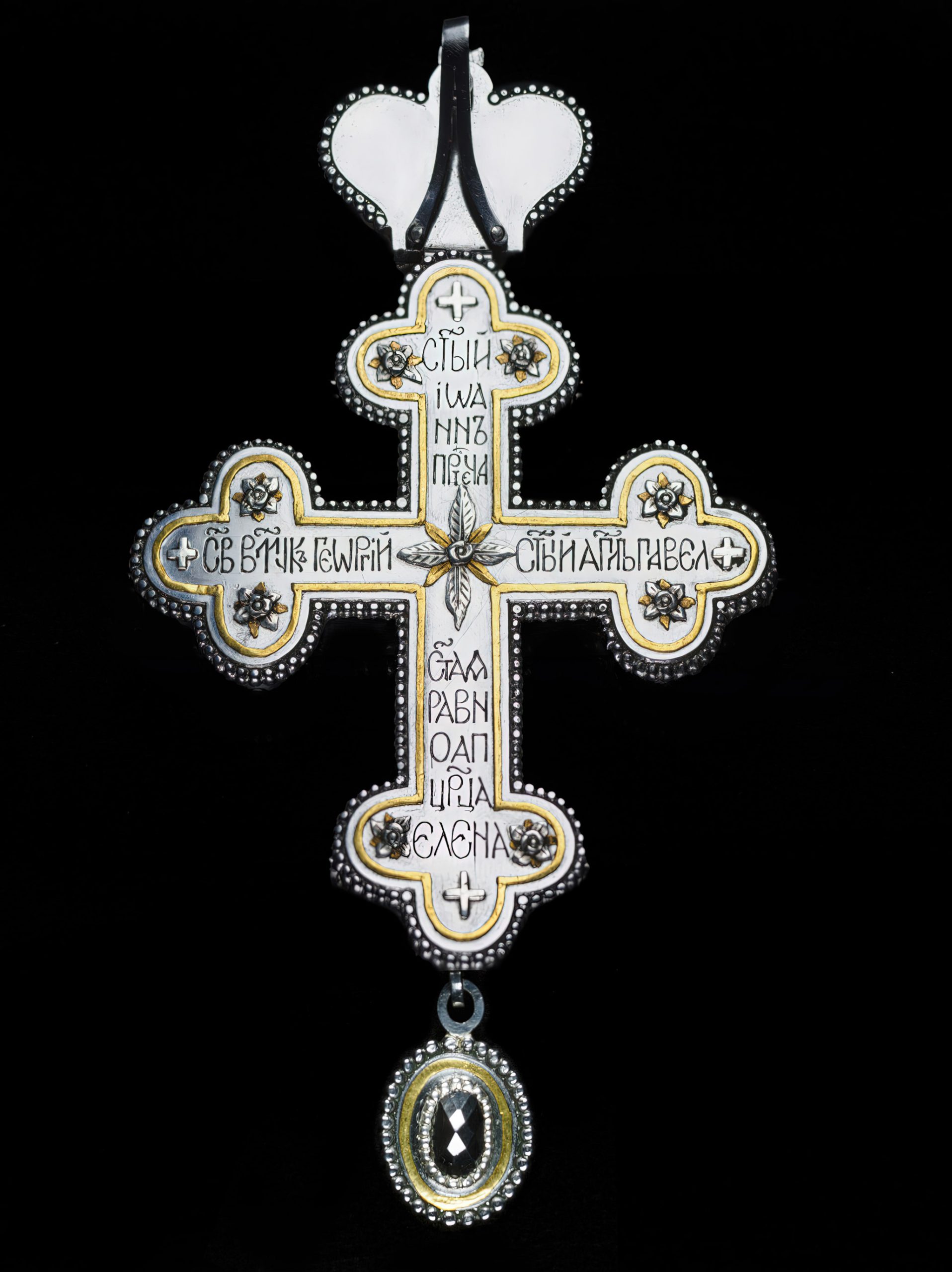 Стальной крест с геометричными гранями на черном фоне, работа Константина Лаптева Предметная съемка стального креста — драгоценные камни заменены геометрией металла Неординарный дизайн креста из стали, макро-детализация поверхности