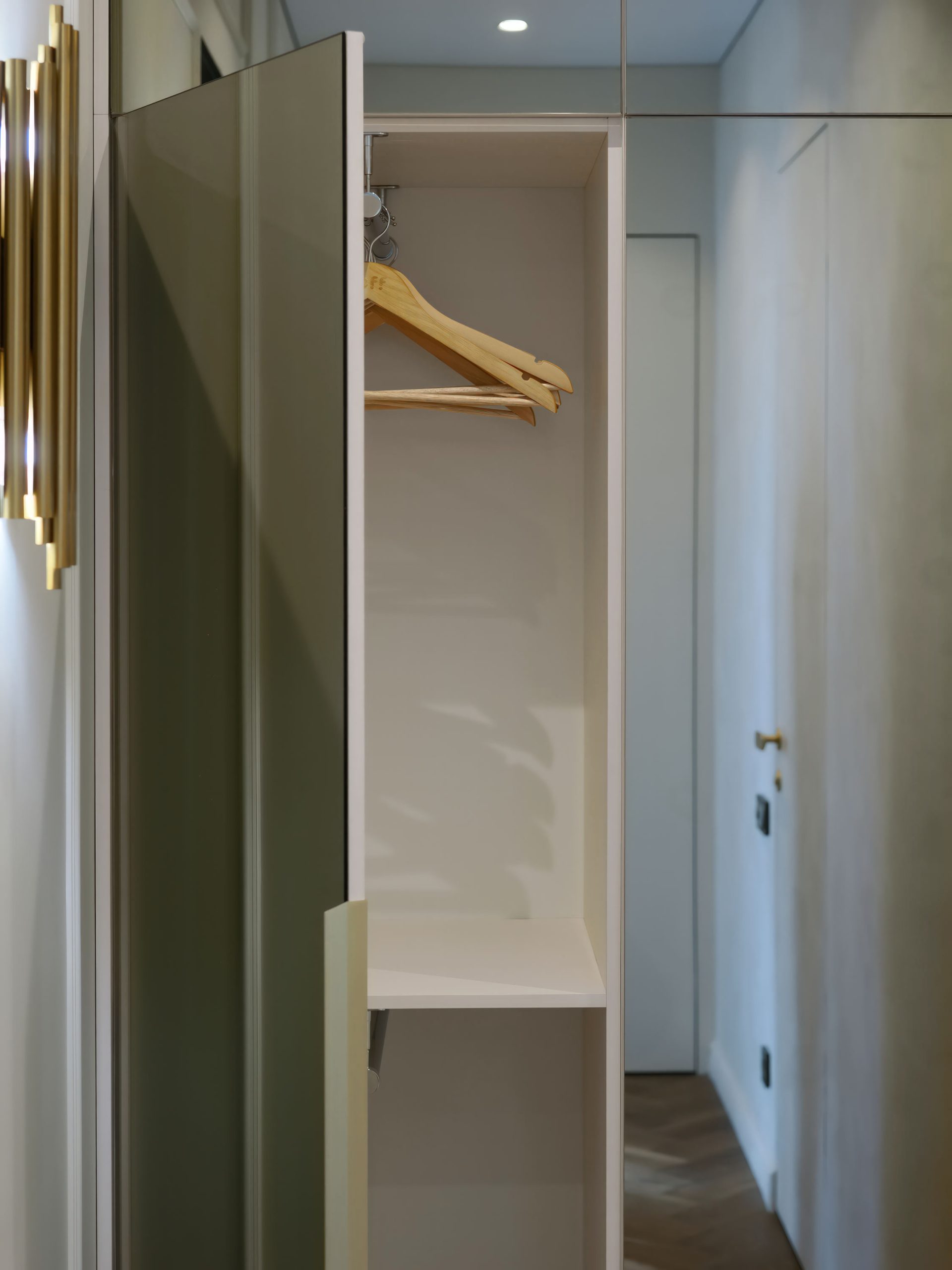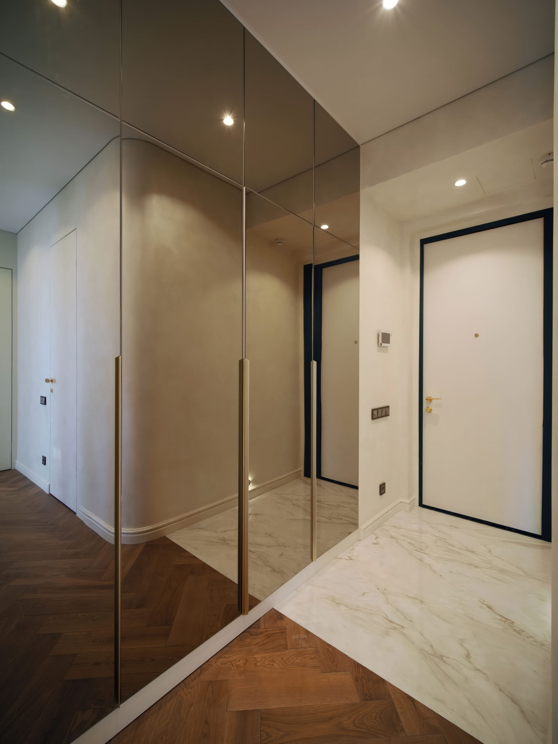 Вид в квартиру при входе. Демонстрация зеркального шкафа. Вид на входную дверь из общей зоны этажа. Входная группа — это важно.