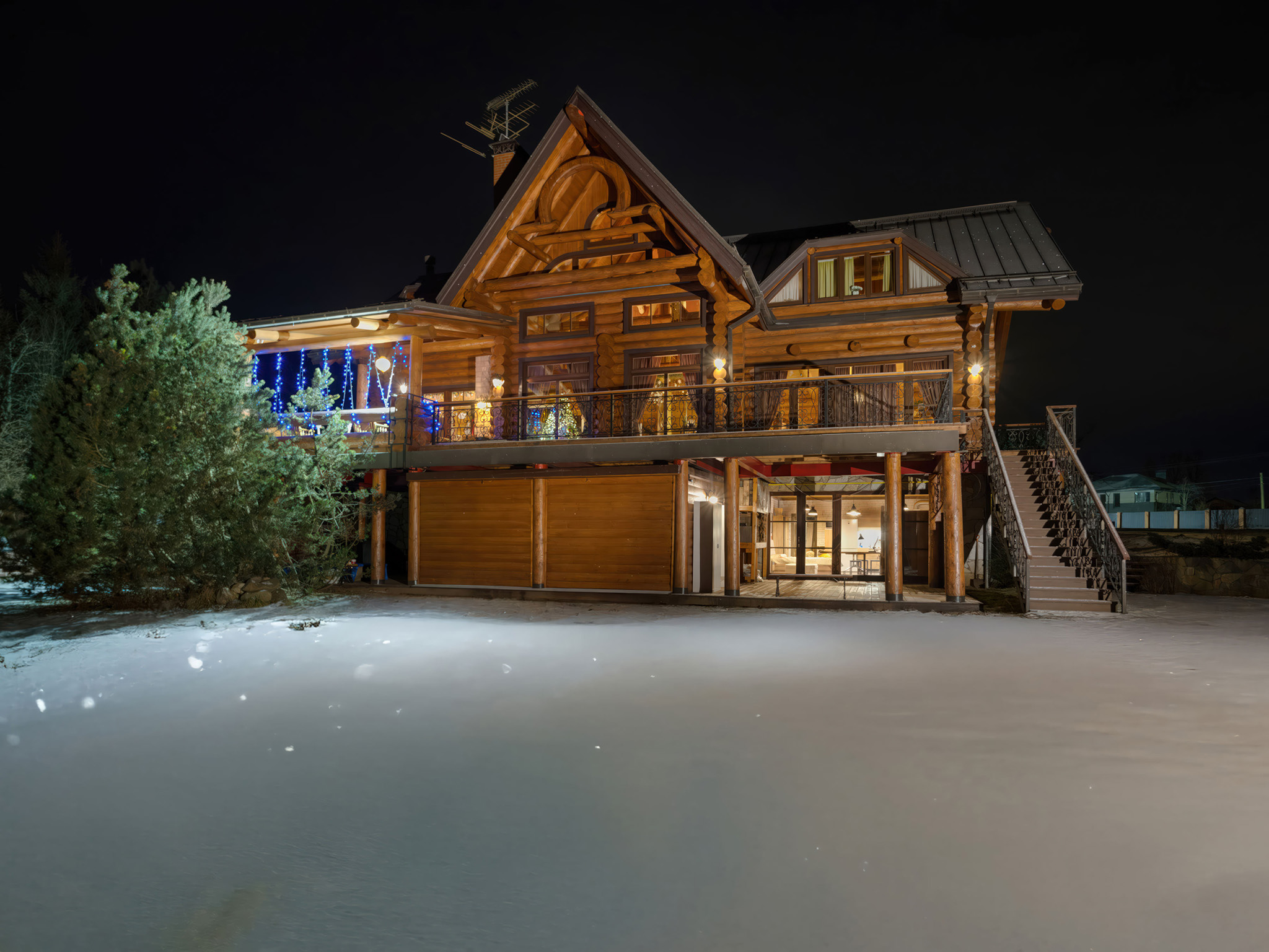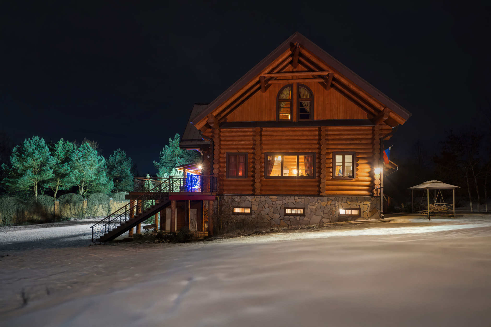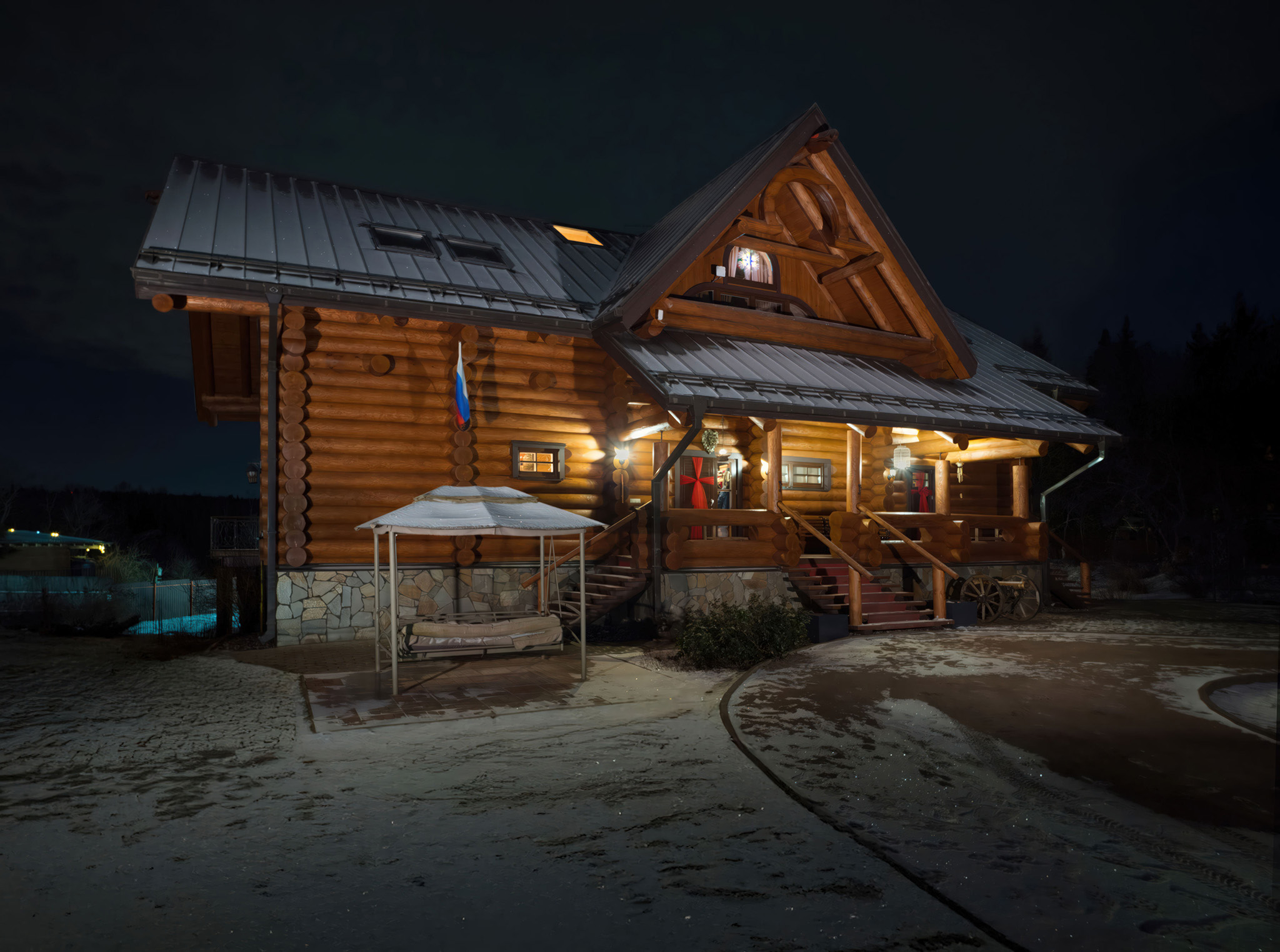 Для загородных частных домов ночная съемка проводится с дополнительным аккумуляторным светом (про приборы и проблемы ↴ ). Конечно, почти у каждого дома есть подсветка. Но она редко годится для фото: она не та.